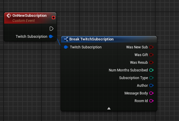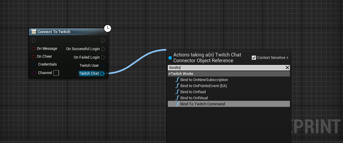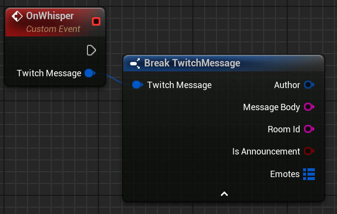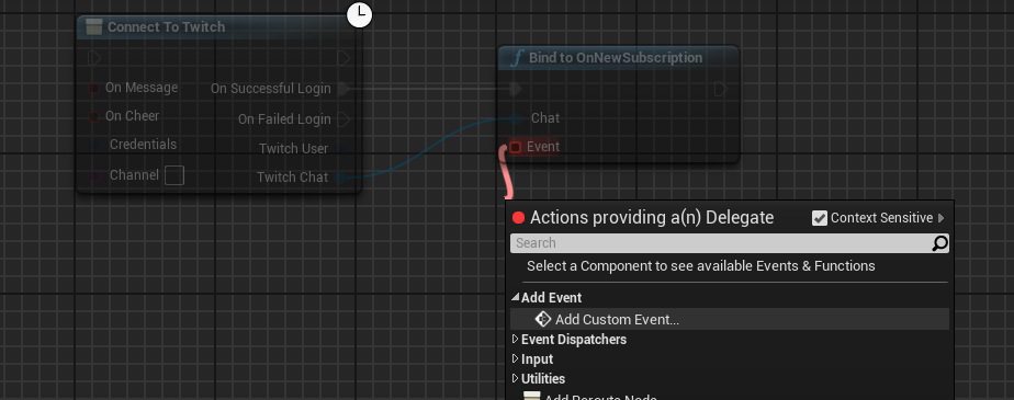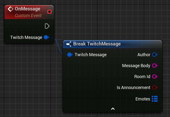 But first, let's take a quick look at binding to these events. Drag out from your Connect to Twitch node's Twitch Chat pin, and select the event you would like to bind to.